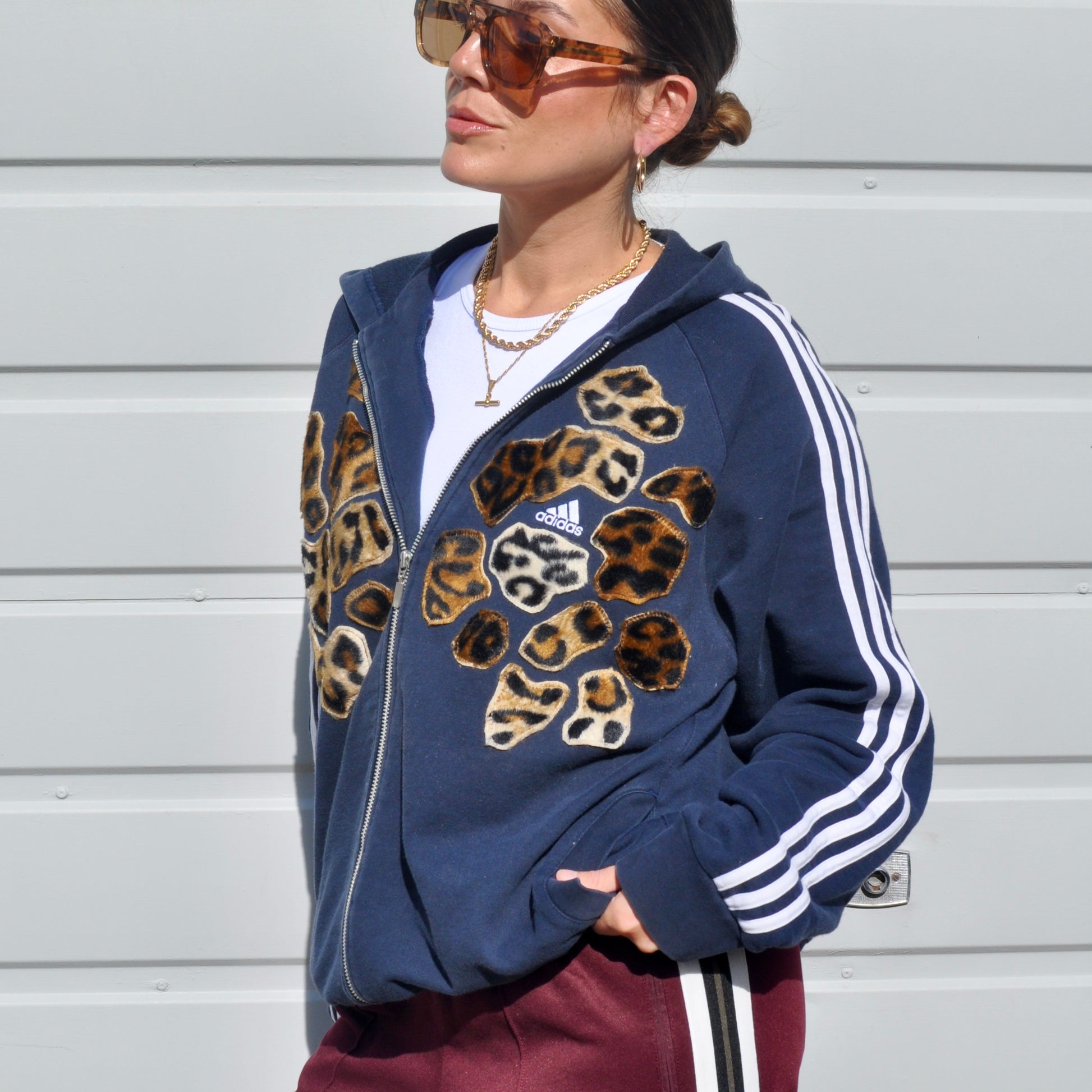 Navy blue adidas hoodie. I’ve sewn patches of velboa short fur leopard fabric over some small flaws.