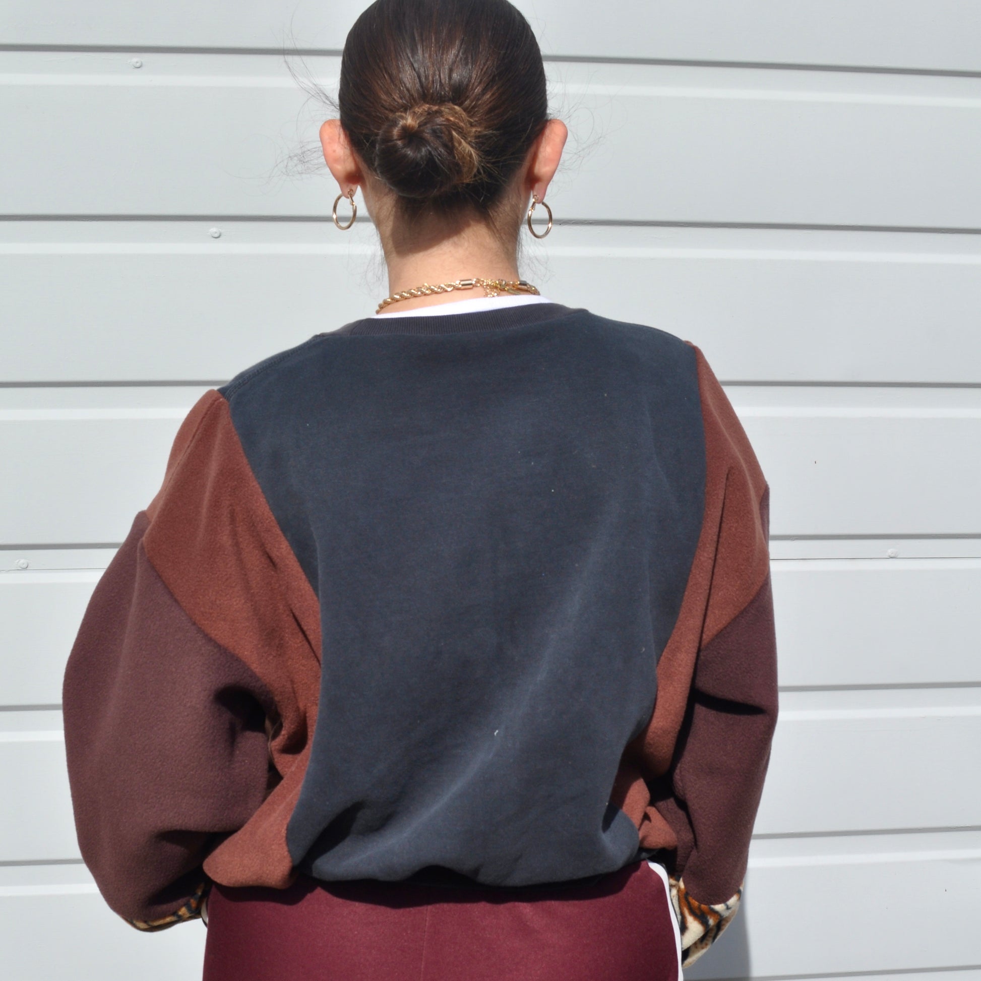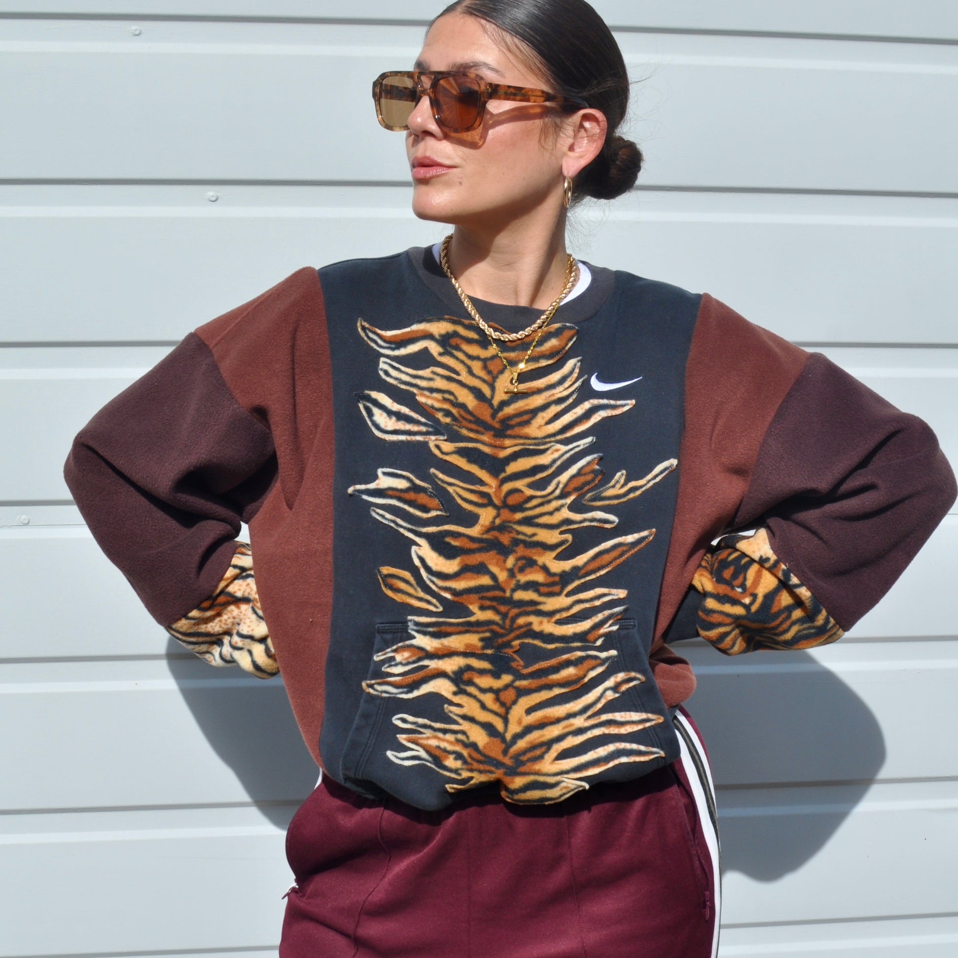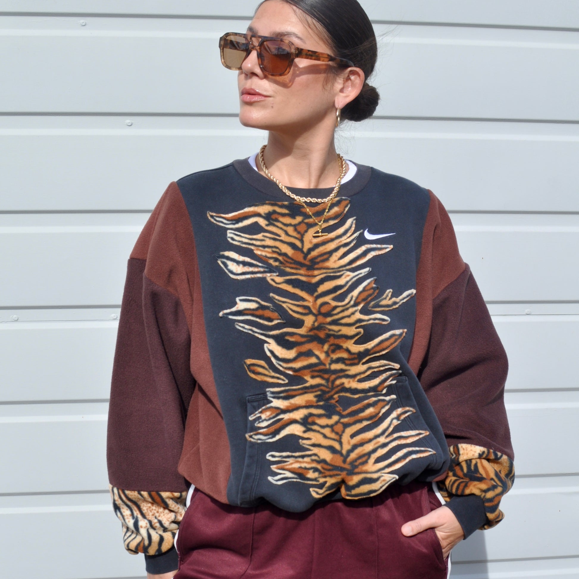 This Nike sweatshirt started as a heavily stained item. Iv covered the stains with a large panel of tiger stripe fleece. The body has been reconstructed with brown fleece. It’s a second hand piece but is now in very good condition.