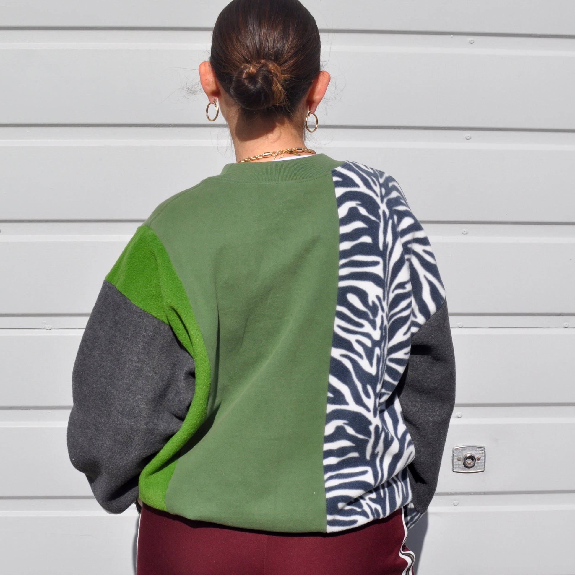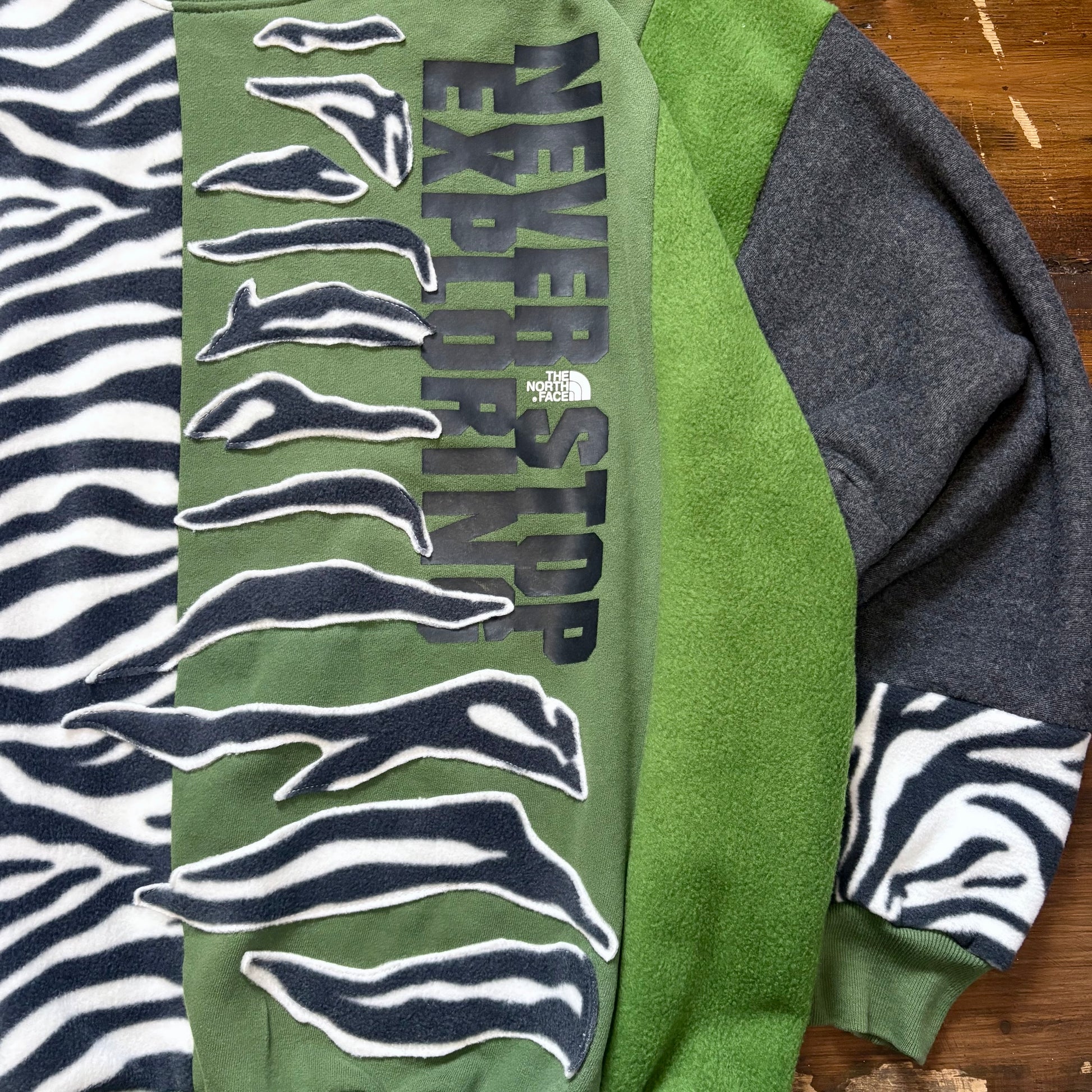 I salvaged part of a north face hoodie and reconstructed it into a new piece using green, charcoal and zebra print fleece. I also used scraps of zebra stripes to cover some small imperfections that were left. It’s a second hand piece but is now in very good condition.